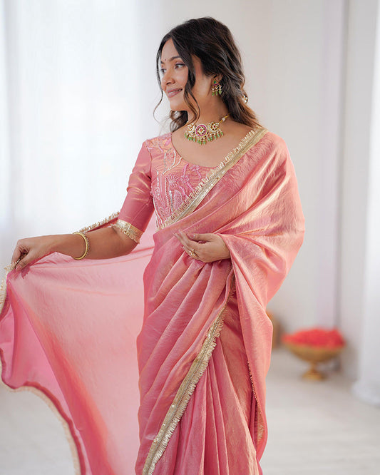 This saree is a perfect blend of tradition and elegance. The rich contrast of deep soft pink with golden, highlighted by a classic gold zari border, gives it a timeless and graceful appeal.