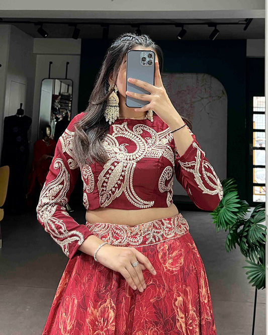 Red Color Tasar Silk Printed Embroidered Lehenga Choli