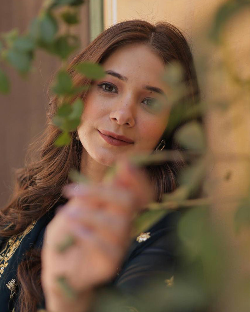 Make a statement with this Peacock Color Faux Blooming Embroidered Gown. Showcasing intricate embroidery on luxurious fabric, this gown is ideal for weddings, receptions, and festive occasions.