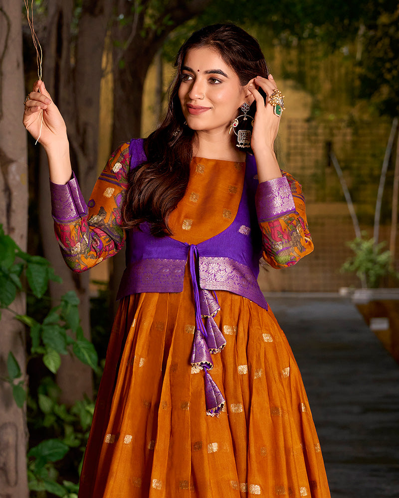 “Elegant Mustard Color Poly Cotton Gown with Koti combines style and comfort effortlessly. The vibrant mustard shade paired with a chic koti gives a graceful ethnic look, perfect for festive occasions and celebrations.”