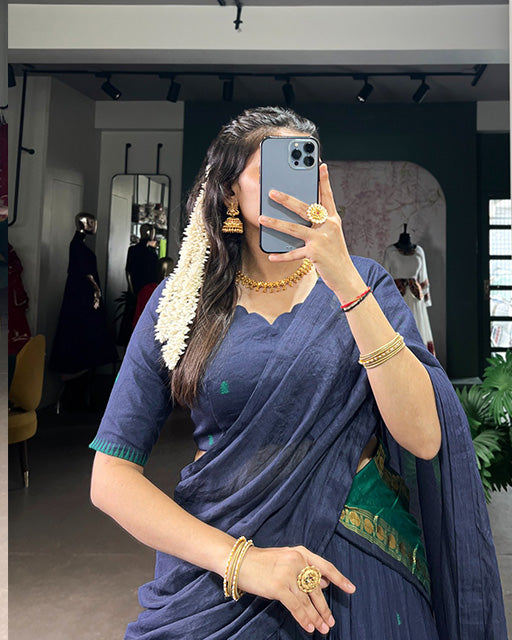 "Step into elegance with this navy blue Chanderi cotton half saree lehenga choli. Crafted from lightweight, breathable fabric, it features intricate detailing and a graceful drape, perfect for festive occasions and special celebrations."