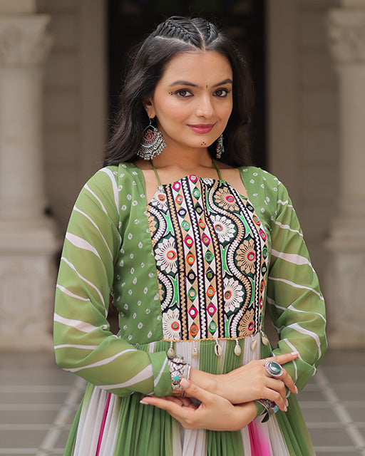 Green Faux Georgette Bandhej Print Navratri Gown – A lively festive gown made from soft faux georgette, beautifully designed with traditional Bandhej print. Ideal for Navratri, garba nights, and cultural celebrations, it offers elegance with ethnic charm.