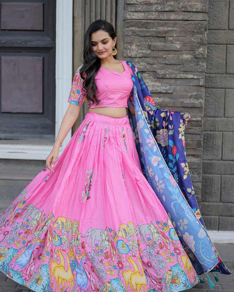 Elevate your ethnic style with our Pink and Blue Color Designer Printed Lehenga Choli. This enchanting ensemble blends the charming hues of pink and blue in a captivating fusion. The lehenga is adorned with intricate prints that add a touch of contemporary elegance to the traditional silhouette. Perfect for festive occasions, the set includes an unstitched blouse, allowing you to customize the fit and style to your preference. Make a memorable statement at weddings, parties, or special celebrations with the vibrant allure of this pink and blue printed lehenga choli, designed to capture hearts and leave a lasting impression.