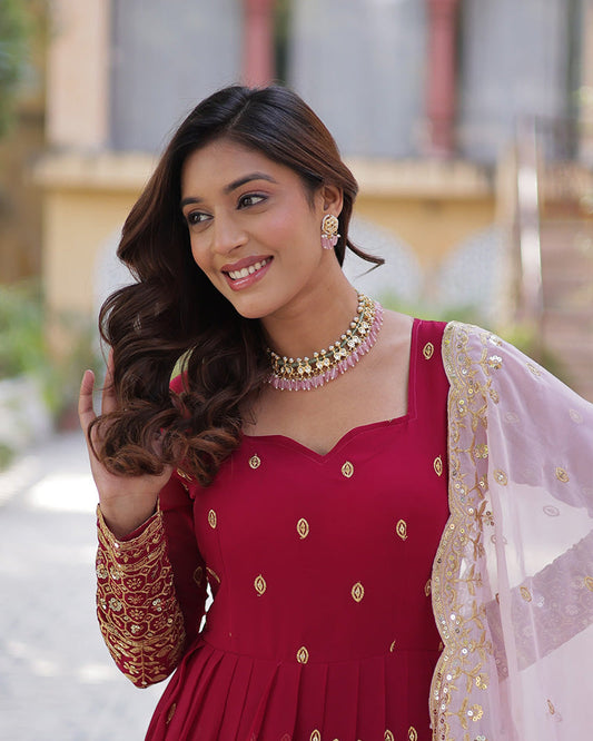 Royal Maroon Color Faux Blooming Zari Embroidered Work Gown