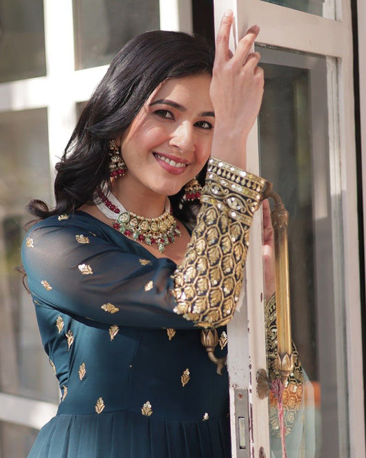 Deep Teal Green Color Designer Golden Embroidered Gown
