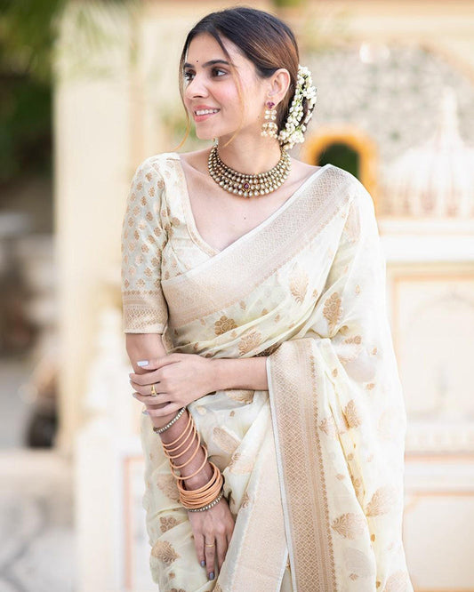 Cream Color Banarasi Jacquard Soft Silk Saree