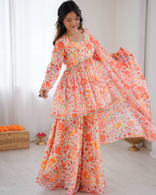 Designer Orange Color Organza Floral Printed Plazzo Suit