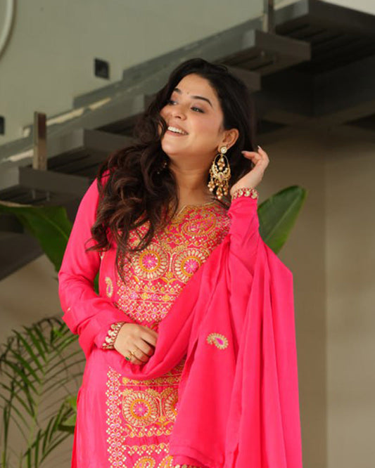 Rani Pink Color Soft Crunchy Silk Embroidered Plazzo Suit