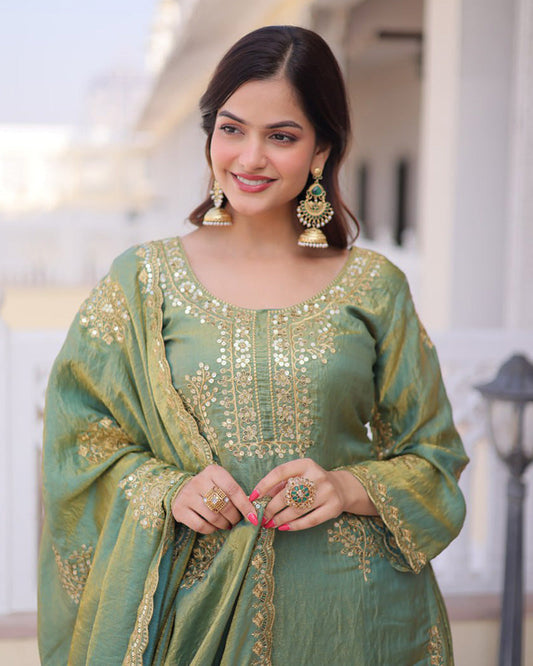 Mehndi Color Fendi Silk Three Piece Plazzo Suit