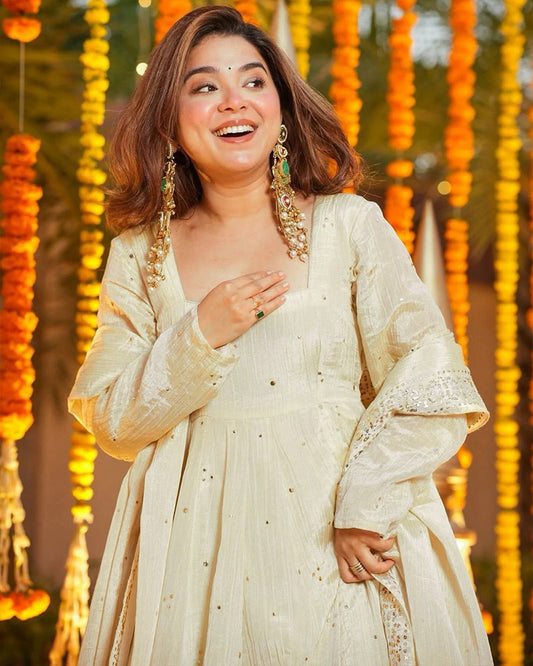 Cream Color Chinnon Silk Mukaish Work Plazzo Suit