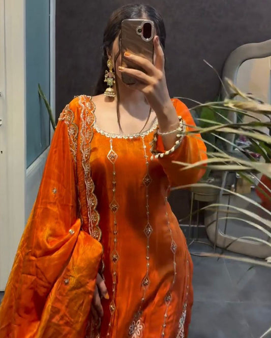 Rust Orange Color Fendi Silk Three Piece Kurti Suit