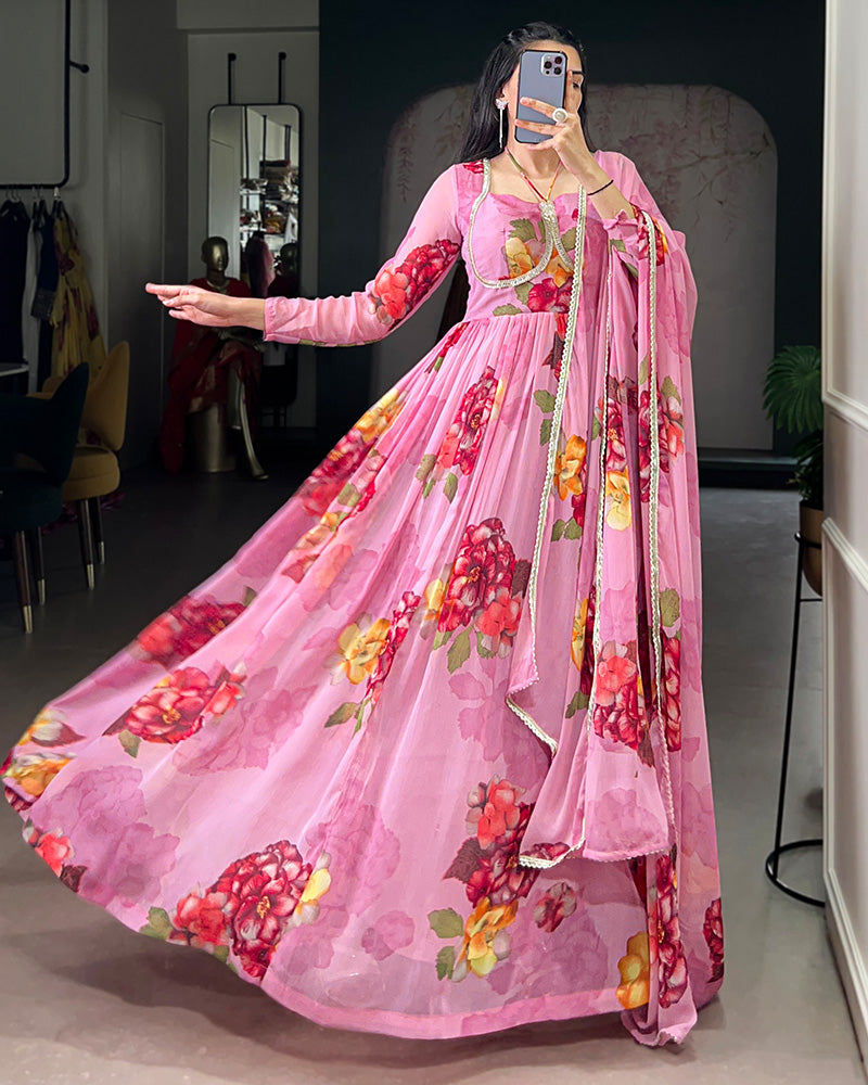 Light Pink Color All Over Floral Printed Chiffon Gown