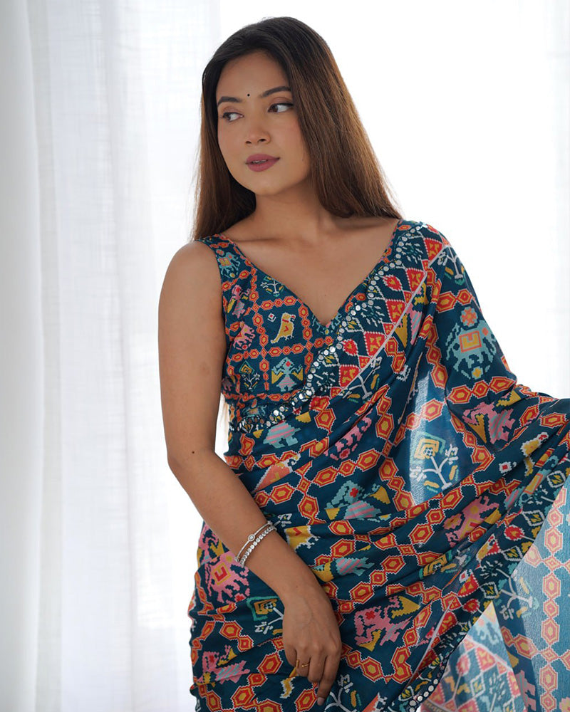 Elevate your festive look with this rama color Chinnon silk printed saree, featuring delicate and elegant prints. Paired with an unstitched blouse, it’s perfect for weddings, traditional gatherings, and celebratory occasions.