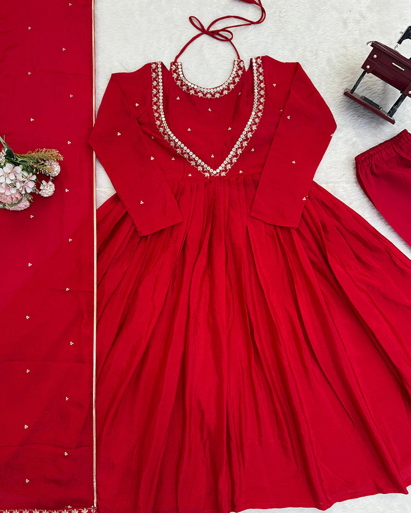 Step into festive elegance with this Red Color Chinon Silk Embroidered Palazzo Suit, crafted from soft and flowy chinon silk for a graceful drape. Accented with intricate embroidery, it offers a stylish yet comfortable look—perfect for weddings, parties, and special occasions.