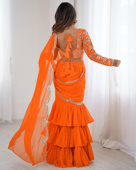 Orange Color Faux Georgette Ruffle Lehenga Saree
