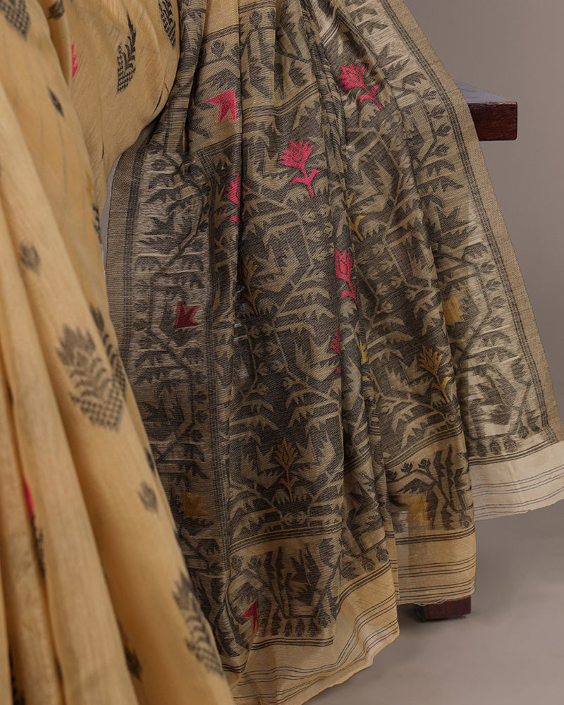 A vibrant yellow saree crafted from soft poly cotton, featuring elegant thread weaving for a subtle traditional touch. Lightweight and comfortable, perfect for casual outings and festive occasions. Comes with an unstitched blouse for a personalized fit.