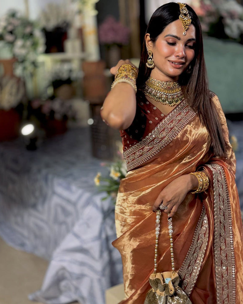 Brown Color Soft Twil Net Embroidered Saree