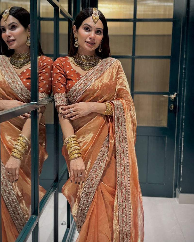 Grace your special occasions with this Brown Soft Twill Net Embroidered Saree, crafted to exude subtle elegance and charm. The delicate embroidery enhances its refined appeal, while the lightweight net fabric drapes beautifully for a flattering look. Paired with an unstitched blouse, it allows you to customize the fit to your style perfectly.