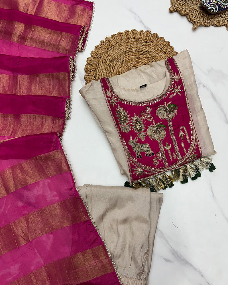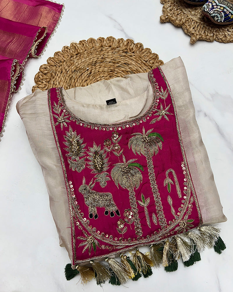 Cream Color Soft Organza Three Piece Kurti Suit