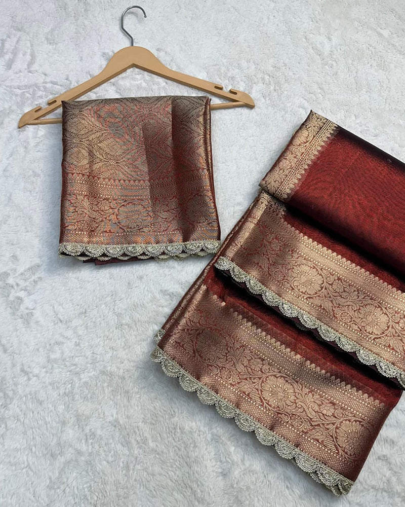 Experience timeless elegance with this Maroon Color Banarasi Tissue Saree. Crafted from luxurious Banarasi tissue fabric, it features a subtle sheen and intricate woven detailing that exude royal charm. The rich maroon hue enhances its traditional appeal, making it a perfect choice for weddings, festive occasions, and grand celebrations.