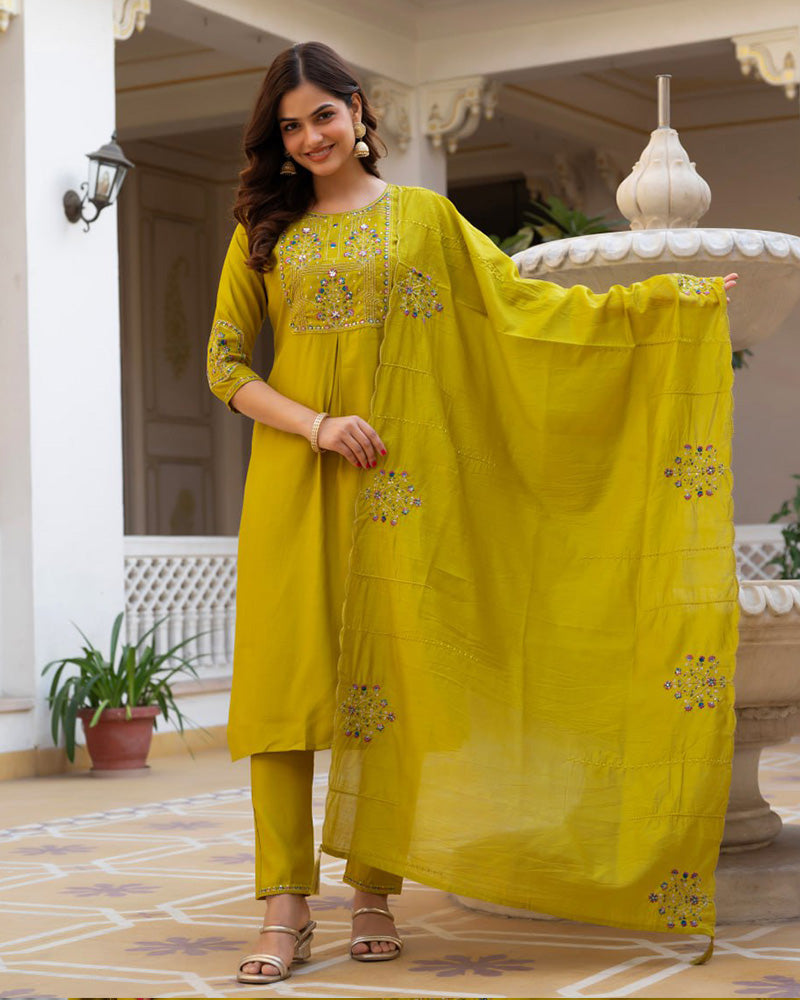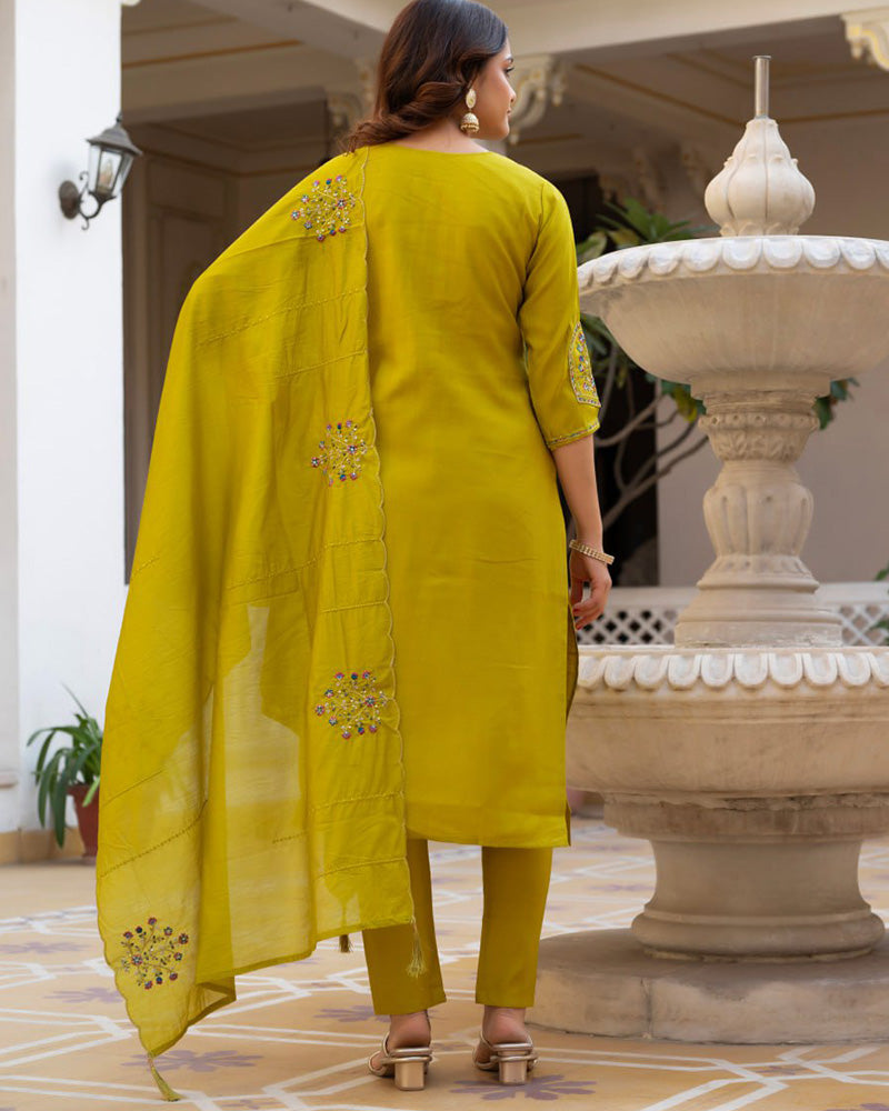 Olive Green Color Mango Silk Embroidered Kurti Suit