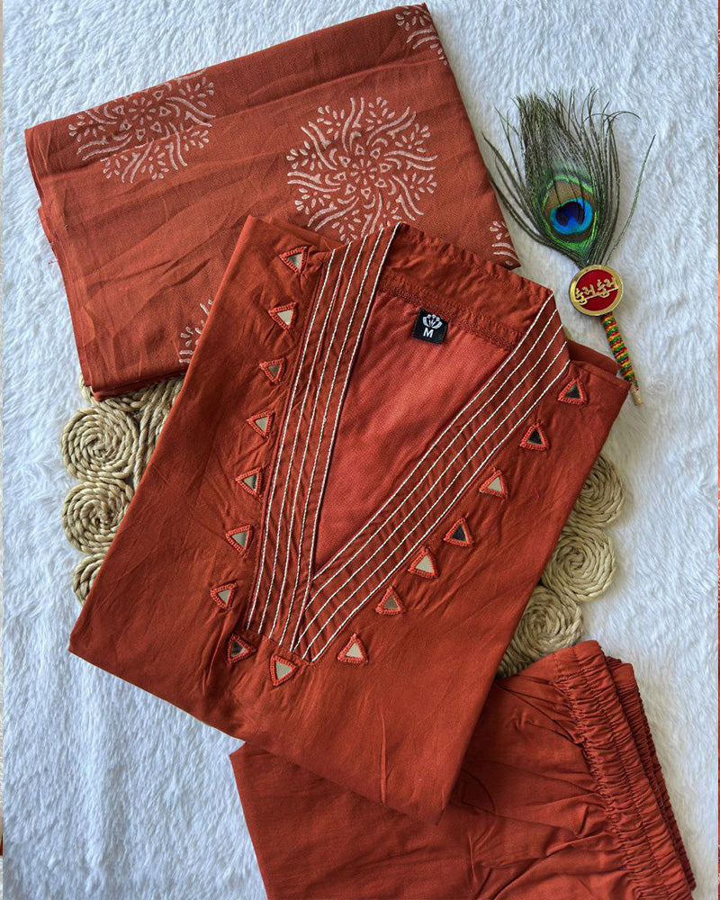 Rust Orange Color Pure Cotton Three Piece Kurti Suit