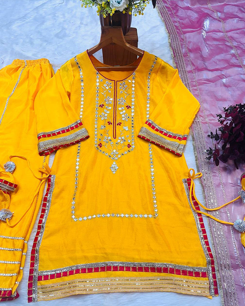 Yellow Color Chinon Silk Embroidered Sharara Suit